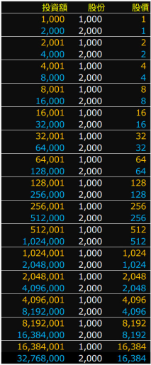 - 新創公司創立成功後,初始股價將定為$1,投資人以當初的投資額兌換為同等價格的股份。然而若釋出的初始股份數量因此大於2000,那初始股價則會乘以2,直到釋出股份數量小於等於2000為止。當初始股價在$1元以上時,投資額當初投資金額不足購買1股股份的額度將會退款給投資人。但這個退款動作也可能導致釋出的初始股份小於1000,此時股價則會除以2回來,在此情況下,初始釋出股份會大於2000。
